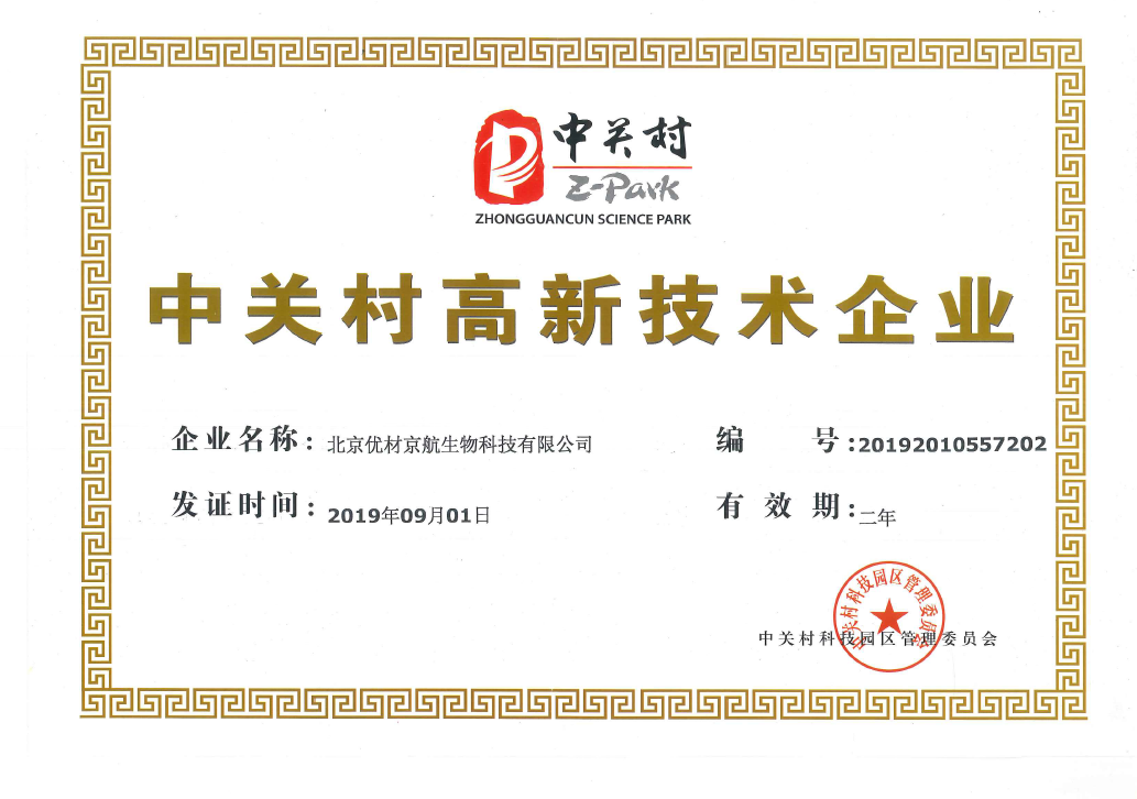 優(yōu)材京航榮獲“中關村高新技術企業(yè)”證書
