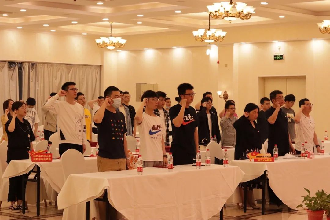 大家高舉右拳,在鮮艷的團旗下再次莊嚴(yán)宣讀入團誓詞,鏗鏘有力的宣誓聲回蕩在會場。